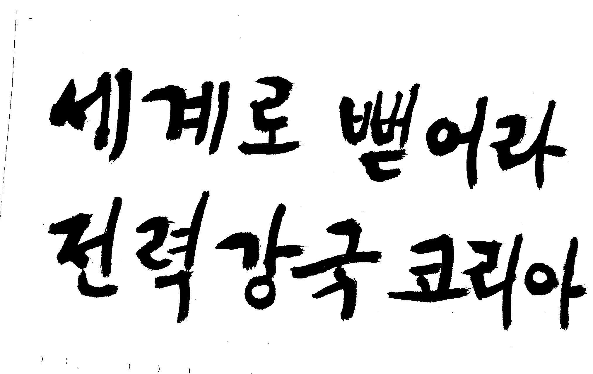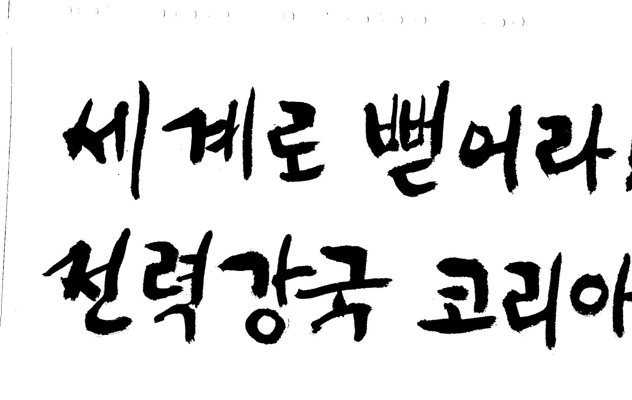 캘리 좀 부탁드려요!~ 김철호 일반 1 12304 2008.12.24 12:08 > > 전력회사 신문광고를 하는데요 캘리로 멋지게 하고픈데 > 캘리프로그램으로 아무리 써도 느낌이 안나옵니다 ㅜ.ㅜ > 이런걸 부탁한다는 자체가 너무나도 염치없지만 부탁드립니다. > > 세계로 뻗어라! 전력강국 코리아 > 보기는 쉬워도 하기는 어려운게 세상 모든 일 일겁니다. 그중에 캘리그라피가 그런것 일 겁니다... 스캔중에 글꼴이 잘린것은 서로다른글꼴서 편집하시길... 글수가 많아서 어쩔 수없네요...