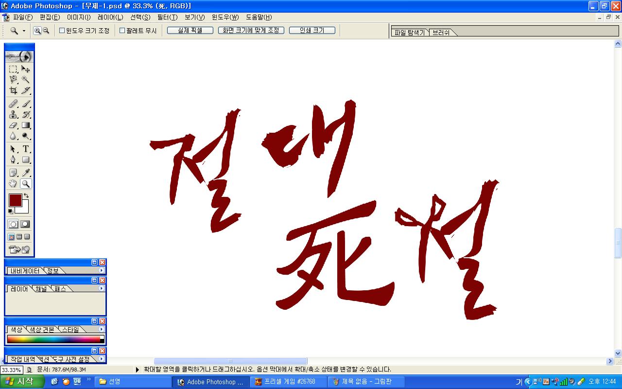 정중히 캘리 부탁드립니다. -_- 류재철 일반 0 5676 2009.11.16 11:18 실력자 분들이 많이 계셔서 이렇게 염치없게 부탁드립니다. - 절대死절 : 첨부한 파일 참고해주시면 감사하겠습니다.(약간 거친느낌? ^^;;) : '절'자의 ㅈ은 가위로...^^;; : 포스터 제작용이라 ai 파일이 필요합니다. 대학동아리 연극공연 포스터로 쓸 예정입니다. 비상업적인 공연이라 이렇게 부탁드립니다.